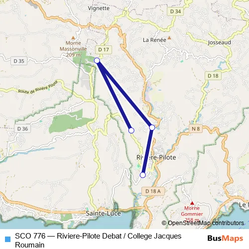 The first stop of the SCO 776 bus route is Riviere Pilote - College Jacques Roumain and the last stop is Riviere Pilote - Coulange. SCO 776 (Riviere-Pilote Debat / College Jacques Roumain) is operational during on weekdays.