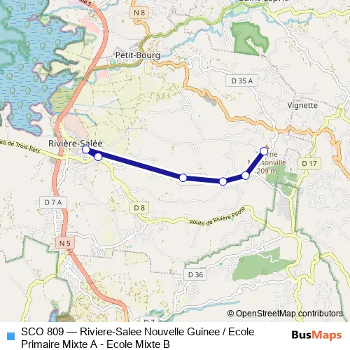 The first stop of the SCO 809 bus route is Riviere Salee - Nouvelle Guinee and the last stop is Riviere Salee - Ecole Primaire Mixte B. SCO 809 (Riviere-Salee Nouvelle Guinee / Ecole Primaire Mixte A - Ecole Mixte B) is operational during everyday.