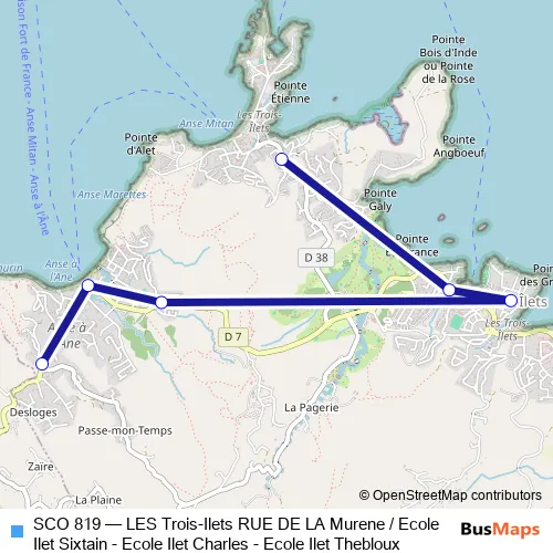 The first stop of the SCO 819 bus route is Les Trois Ilets - Ecole Ilet Thebloux and the last stop is Les Trois Ilets - Rue de la Murene. SCO 819 (LES Trois-Ilets RUE DE LA Murene / Ecole Ilet Sixtain - Ecole Ilet Charles - Ecole Ilet Thebloux) is operational during everyday.