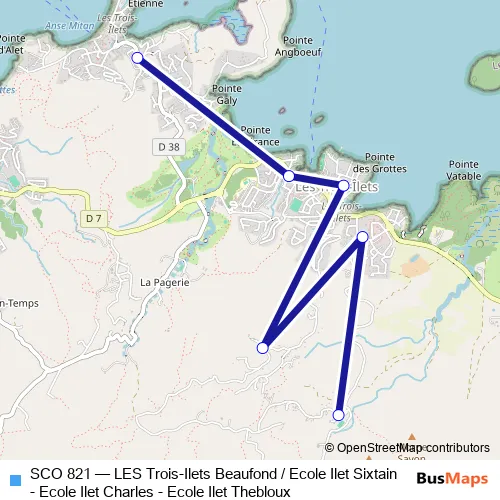 The first stop of the SCO 821 bus route is Les Trois Ilets - Ecole Ilet Thebloux and the last stop is Les Trois Ilets - Beaufond. SCO 821 (LES Trois-Ilets Beaufond / Ecole Ilet Sixtain - Ecole Ilet Charles - Ecole Ilet Thebloux) is operational during everyday.