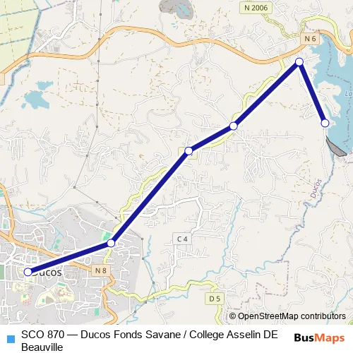 The first stop of the SCO 870 bus route is Ducos - Fonds Savane and the last stop is Ducos - College Asselin de Beauville. SCO 870 (Ducos Fonds Savane / College Asselin DE Beauville) is operational during on weekdays.