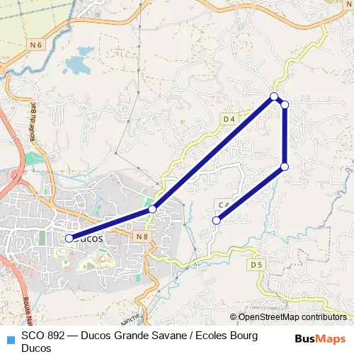 The first stop of the SCO 892 bus route is Ducos - Grande Savane and the last stop is Ducos - Ramassage scolaire Ecoles et College. SCO 892 (Ducos Grande Savane / Ecoles Bourg Ducos) is operational during everyday.