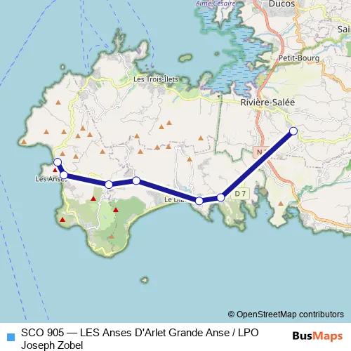 The first stop of the SCO 905 bus route is Riviere Salee - Lycee Thoraille J.Zobel and the last stop is Les Anses d'Arlet - Grande Anse. SCO 905 (LES Anses D'Arlet Grande Anse / LPO Joseph Zobel) is operational during on weekdays.