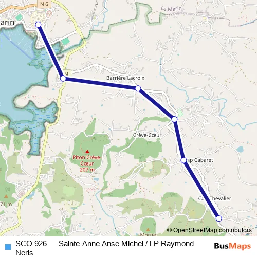 The first stop of the SCO 926 bus route is Le Marin - Lycee Raymond Neris and the last stop is Sainte Anne - Anse Michel. SCO 926 (Sainte-Anne Anse Michel / LP Raymond Neris) is operational during everyday.