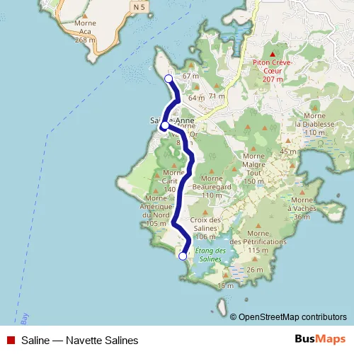 The first stop of the Saline bus route is Sainte Anne - Belfond/Club Med and the last stop is Sainte Anne - Plage DES Salines. Saline (Navette Salines) is operational during on weekends.