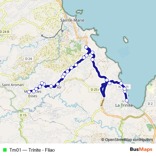 The first stop of the Tm01 bus route is Gare Routiere Trinite and the last stop is Filao. Tm01 (Trinite - Filao) is operational during everyday.