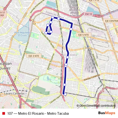 The first stop of the 107 bus route is Calz. México Tacuba - Frente a Metro Tacuba and the last stop is Cetram Metro Rosario Anden A. 107 (Metro El Rosario - Metro Tacuba) is operational during everyday.