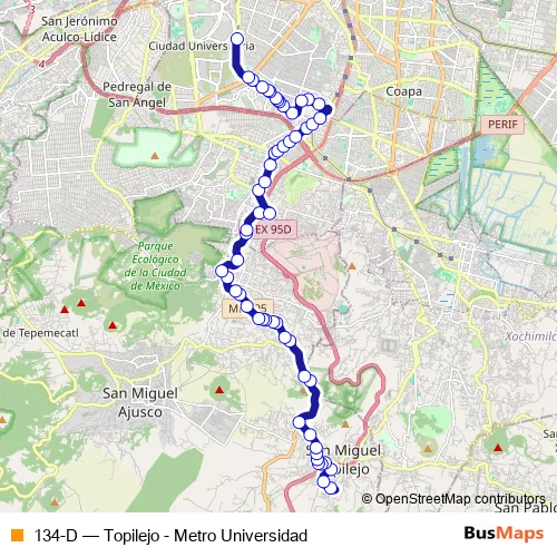 The first stop of the 134-D bus route is Santa Cruz and the last stop is Cetram Universidad anden B. 134-D (Topilejo - Metro Universidad) is operational during everyday.