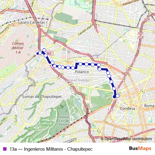 The first stop of the 13a bus route is Av. Ingenieros Militares y Av. Lomas de Sotelo and the last stop is Chapultepec. 13a (Ingenieros Militares - Chapultepec) is operational during everyday.
