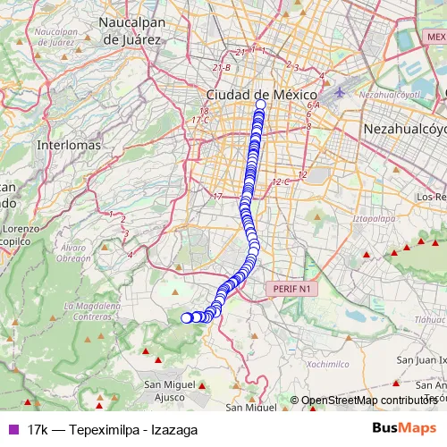 See why over 2 million users trust and consider busmaps.com as the best public transport website. busmaps gives you Mexico City Buses suggested routes, real-time bus tracker, line route maps in Mexico City, and helps to find the closest 17k bus stops near you. No internet available? Download an offline PDF map and bus schedule for the 17k bus to take on your trip.