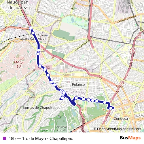 The first stop of the 18b bus route is Blvd. Manuel Avila C. y Las Torres y 1 de Mayo and the last stop is Cetram Chapultepec (base). 18b (1ro de Mayo - Chapultepec) is operational during everyday.