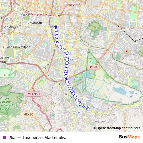 The first stop of the 25a bus route is Base Madreselva and the last stop is Canal de Miramontes y Calz. Tasqueña. 25a (Tasqueña - Madreselva) is operational during everyday.