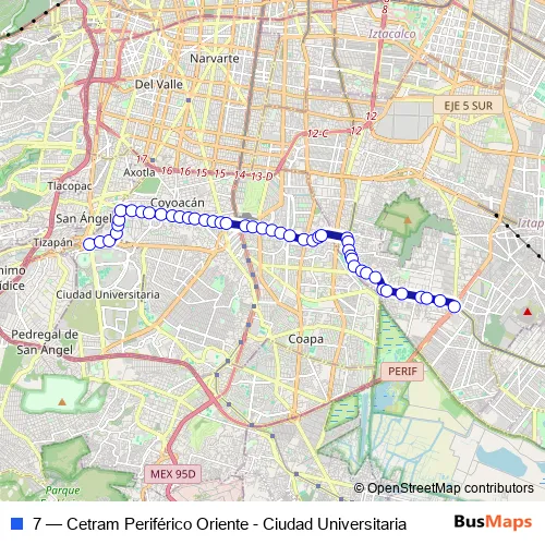The first stop of the 7 bus route is Ciudad Universitaria - Estadio C.U. and the last stop is Cetram Periférico. 7 (Cetram Periférico Oriente - Ciudad Universitaria) is operational during everyday.
