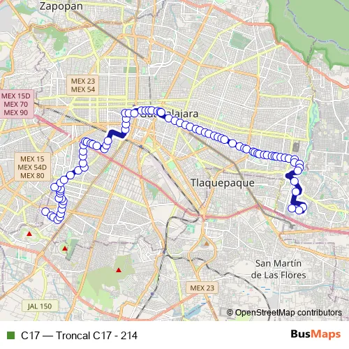 See why over 2 million users trust and consider busmaps.com as the best public transport website. busmaps gives you Guadalajara Buses suggested routes, real-time bus tracker, line route maps in Guadalajara, and helps to find the closest C17 bus stops near you. No internet available? Download an offline PDF map and bus schedule for the C17 bus to take on your trip.