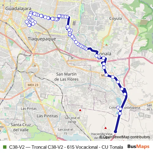 See why over 2 million users trust and consider busmaps.com as the best public transport website. busmaps gives you Tlaquepaque Buses suggested routes, real-time bus tracker, line route maps in Tlaquepaque, and helps to find the closest C38-V2 bus stops near you. No internet available? Download an offline PDF map and bus schedule for the C38-V2 bus to take on your trip.