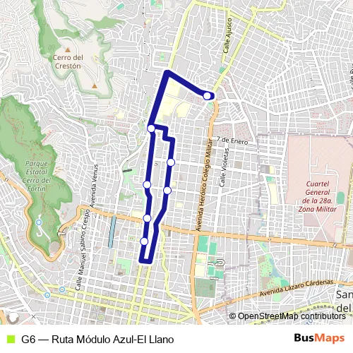 The first stop of the G6 bus route is Módulo Azul and the last stop is Módulo Azul. G6 (Ruta Módulo Azul-El Llano) is operational during everyday.