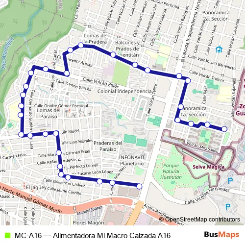 The first stop of the MC-A16 bus route is Volcán Acatenango and the last stop is Calzada Independencia Norte. MC-A16 (Alimentadora Mi Macro Calzada A16) is operational during everyday.