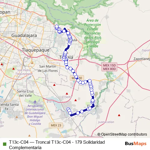 The first stop of the T13c-C04 bus route is Carretera el Salto and the last stop is Atotonilco El Alto. T13c-C04 (Troncal T13c-C04 - 179 Solidaridad Complementaria) is operational during everyday.