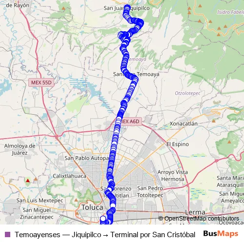 The first stop of the Temoayenses bus route is Calle Emiliano Zapata and the last stop is Avenida Isidro Fabela y Calle Diana Laura Riojas. Temoayenses (Jiquipilco → Terminal por San Cristóbal) is operational during everyday.