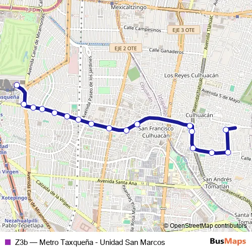 The first stop of the Z3b bus route is Base Cetram Taxqueña and the last stop is Unidad San Marcos - Luna. Z3b (Metro Taxqueña - Unidad San Marcos) is operational during everyday.