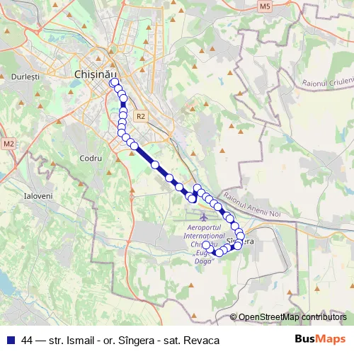 The first stop of the 44 bus route is Dispeceratul Ismail and the last stop is sat. Revaca, str. A. Donici (Stația terminus). 44 (str. Ismail - or. Sîngera - sat. Revaca) is operational during on weekdays.