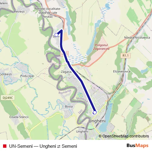 The first stop of the UN-Semeni bus route is Autogara Ungheni, Slavena and the last stop is sat. Semeni, str. D. Prut. UN-Semeni (Ungheni ⇄ Semeni) is operational during everyday.