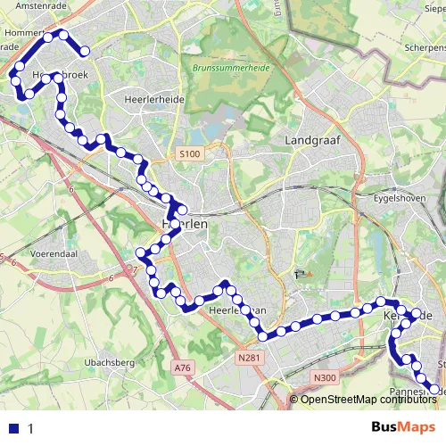 The first stop of the 1 bus route is Kerkrade, Bleijerheide Grens and the last stop is Heerlen, Hoensbroek Busstation. 1 is operational during everyday.