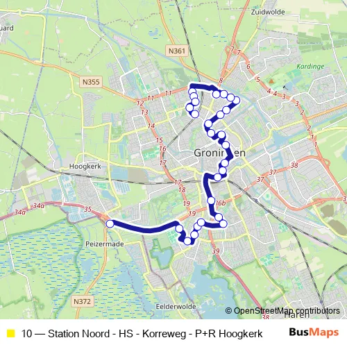 The first stop of the 10 bus route is Groningen, P+R Hoogkerk (Perron D) and the last stop is Groningen, Station Noord. 10 (Station Noord - HS - Korreweg - P+R Hoogkerk) is operational during everyday.