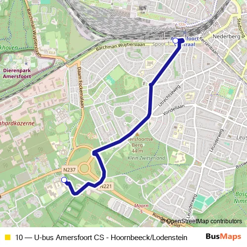 The first stop of the 10 bus route is Amersfoort, Centraal Station and the last stop is A'foort, Hoornbeeck/Van Lodenstein. 10 (U-bus Amersfoort CS - Hoornbeeck/Lodenstein) is operational during on weekdays.