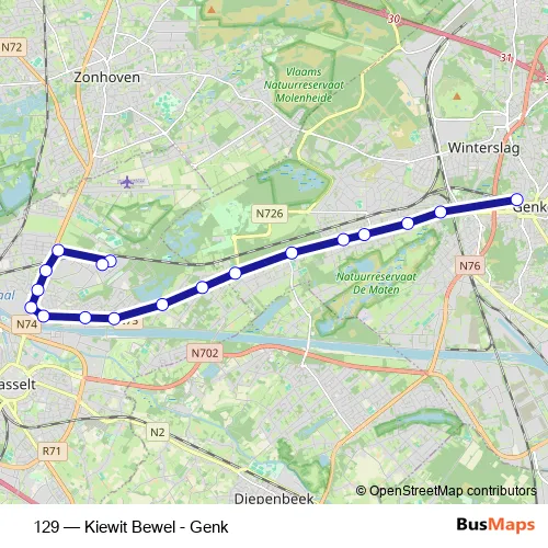 The first stop of the 129 bus route is Kiewit, Bewel I and the last stop is Genk, Station perron 10. 129 (Kiewit Bewel - Genk) is operational during on weekdays.
