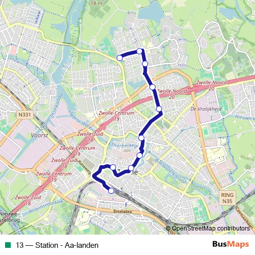 The first stop of the 13 bus route is Zwolle, De Zoom and the last stop is Zwolle, Station. 13 (Station - Aa-landen) is operational during everyday.