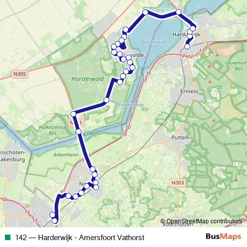 The first stop of the 142 bus route is Harderwijk, Station and the last stop is Amersfoort, Vrouwenpolder. 142 (Harderwijk - Amersfoort Vathorst) is operational during on weekdays.
