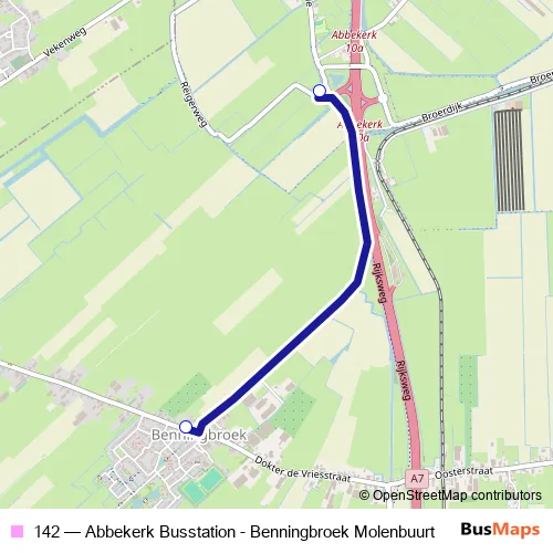 The first stop of the 142 bus route is Abbekerk, Busstation and the last stop is Benningbroek, Molenbuurt. 142 (Abbekerk Busstation - Benningbroek Molenbuurt) is operational during on weekdays.