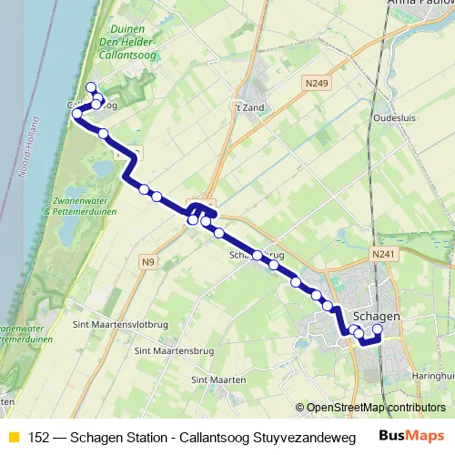 The first stop of the 152 bus route is Callantsoog, Stuyvezandeweg and the last stop is Schagen, Station. 152 (Schagen Station - Callantsoog Stuyvezandeweg) is operational during everyday.