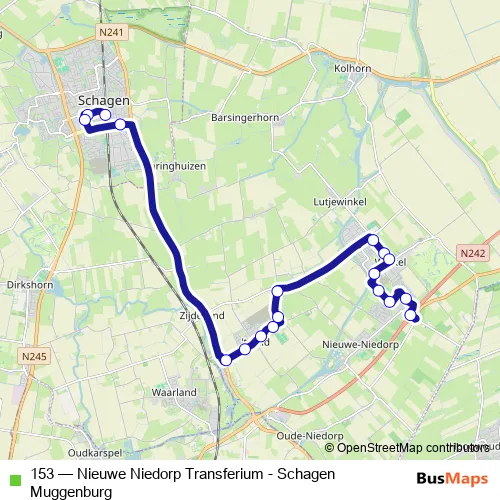 The first stop of the 153 bus route is Schagen, Station and the last stop is Nieuwe Niedorp, Transferium. 153 (Nieuwe Niedorp Transferium - Schagen Muggenburg) is operational during on weekdays.