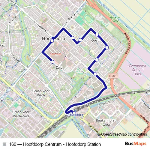 The first stop of the 160 bus route is Hoofddorp, Hoofddorp Station and the last stop is Hoofddorp, Hoofddorp Centrum. 160 (Hoofddorp Centrum - Hoofddorp Station) is operational during on weekdays.