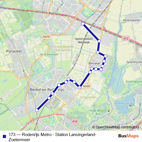 The first stop of the 173 bus route is Zoetermeer, Station Lansingerland-Ztm. (Zuid) and the last stop is Berkel en Rodenrijs, Rodenrijs Metro. 173 (Rodenrijs Metro - Station Lansingerland-Zoetermeer) is operational during everyday.