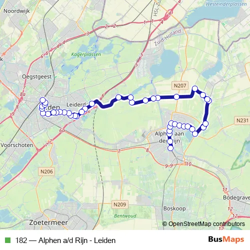The first stop of the 182 bus route is Alphen a/d Rijn, Station (Perron E) and the last stop is Leiden, Station Leiden Centraal (Uitstaphalte). 182 (Alphen a/d Rijn - Leiden) is operational during everyday.
