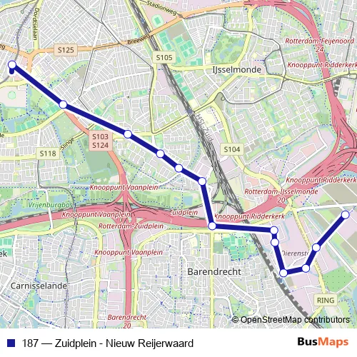 The first stop of the 187 bus route is Ridderkerk, Peterselieweg and the last stop is Rotterdam, Zuidplein Hoog. 187 (Zuidplein - Nieuw Reijerwaard) is operational during on weekdays.
