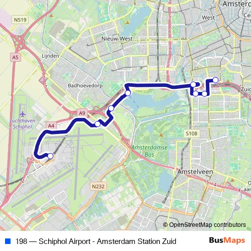 The first stop of the 198 bus route is Amsterdam, Station Zuid and the last stop is Schiphol, Airport. 198 (Schiphol Airport - Amsterdam Station Zuid) is operational during everyday.