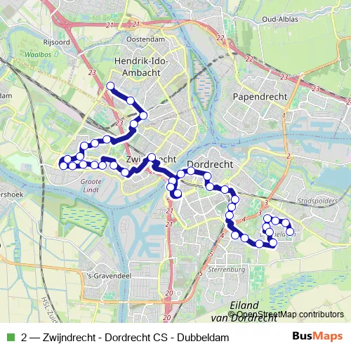 The first stop of the 2 bus route is Dordrecht, Prunuslaan and the last stop is H.I.Ambacht, Sandelingen. 2 (Zwijndrecht - Dordrecht CS - Dubbeldam) is operational during everyday.