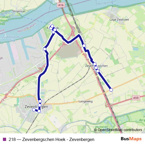 The first stop of the 218 bus route is Zevenbergen, St. Jorisstraat and the last stop is Langeweg, Drie Hoefijzers. 218 (Zevenbergschen Hoek - Zevenbergen) is operational during on weekdays.