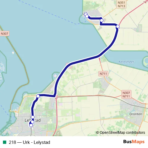 The first stop of the 218 bus route is Urk, Gemeentehuis and the last stop is Lelystad, Station Centrum. 218 (Urk - Lelystad) is operational during on weekdays.