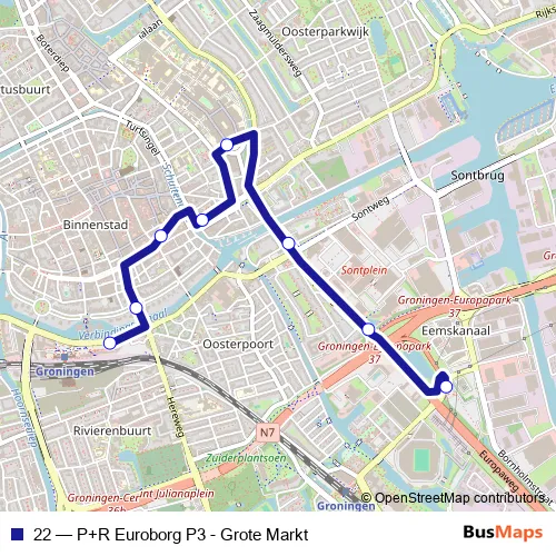 The first stop of the 22 bus route is Groningen, P+R Euroborg P3 (Perron B) and the last stop is Groningen, Hoofdstation, uitstaphalte. 22 (P+R Euroborg P3 - Grote Markt) is operational during everyday.