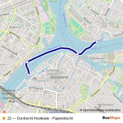 The first stop of the 22 ferry route is Papendrecht, Veerdam and the last stop is Dordrecht, Hooikade. 22 (Dordrecht Hooikade - Papendrecht) is operational during everyday.