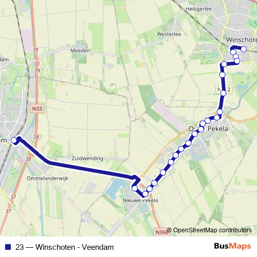 The first stop of the 23 bus route is Winschoten, Station (Perron C) and the last stop is Veendam, Station uitstaphalte. 23 (Winschoten - Veendam) is operational during everyday.
