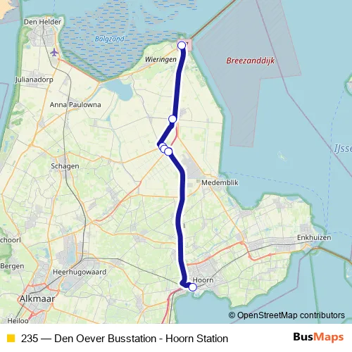 The first stop of the 235 bus route is Den Oever, Busstation and the last stop is Hoorn, Station. 235 (Den Oever Busstation - Hoorn Station) is operational during on weekdays.