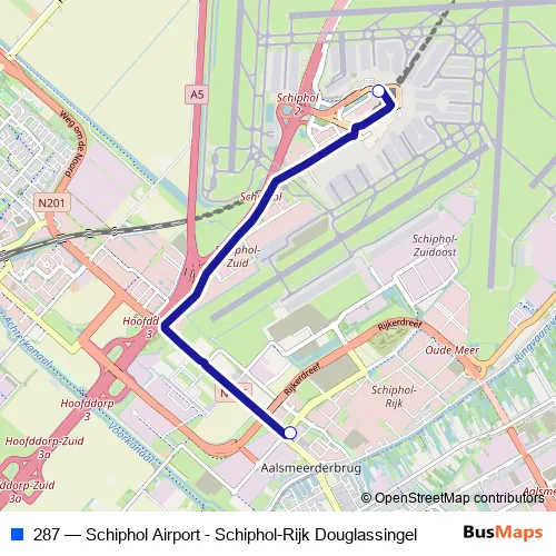 The first stop of the 287 bus route is Schiphol, Airport and the last stop is Schiphol, Knooppunt Schiphol Zuid. 287 (Schiphol Airport - Schiphol-Rijk Douglassingel) is operational during on weekdays.