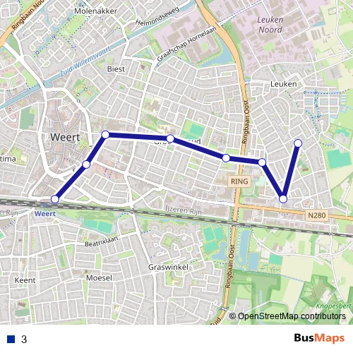 The first stop of the 3 metro route is Weert, Station (Bus) and the last stop is Weert, Middelstestraat. 3 is operational during everyday.