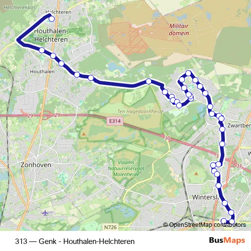 The first stop of the 313 bus route is Helchteren Technische School and the last stop is Genk Station perron 9. 313 (Genk - Houthalen-Helchteren) is operational during on weekdays.